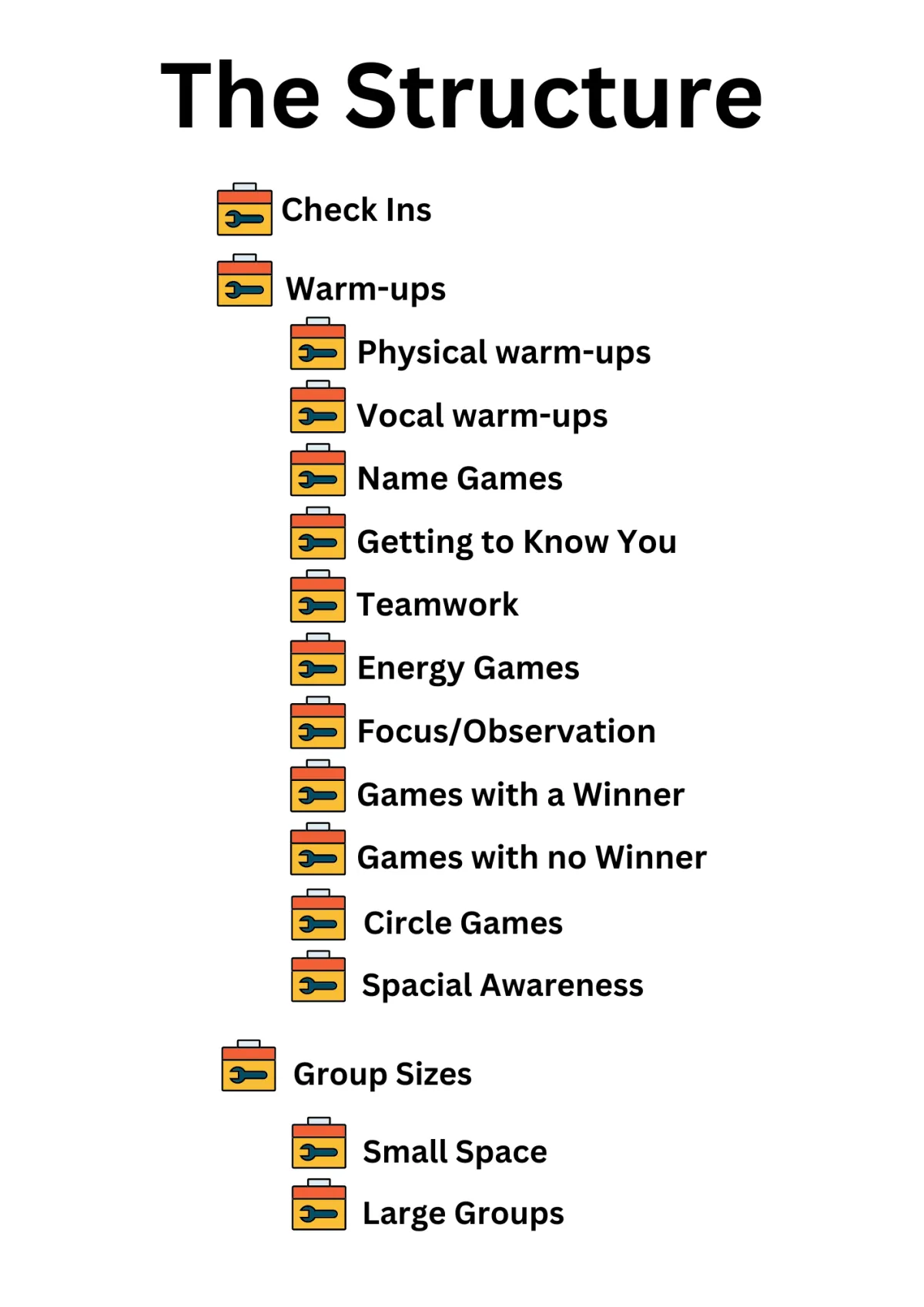 You will find easy-to-access vocal and physical warm-up, ideas for class 'check ins', name games, exercises to enable the class to get to know each other more deeply, games for energy, games for focus and observation, games to teach spacial awareness, games to encourage teamwork, games with winners, games with no winners, there are activities for pairs, activities for large groups, games for small spaces...and that's just the warm-up section! You will find skills-building activities for mime, the voice, facial expression, use of the body and character work.
